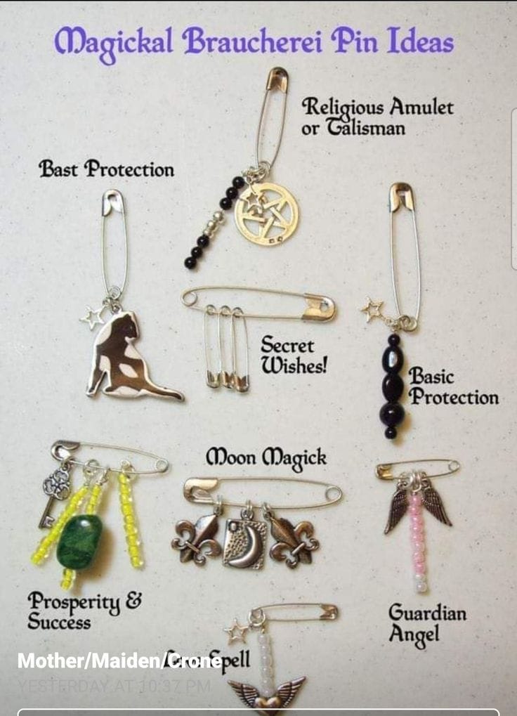 Turn an ordinary pin or brooch into a wearable amulet of protection or intention. Add charms, beads, and small talismans to a safety pin or bar pin, and wear it on your clothing, bag, or hat to carry your magic with you.