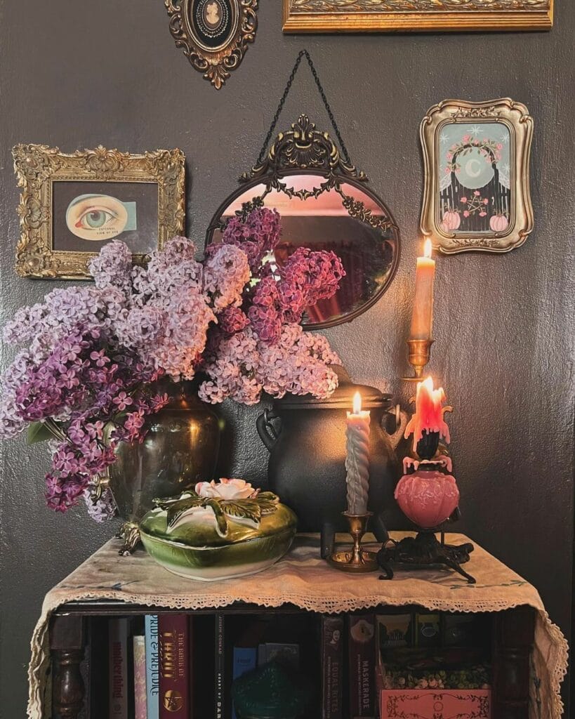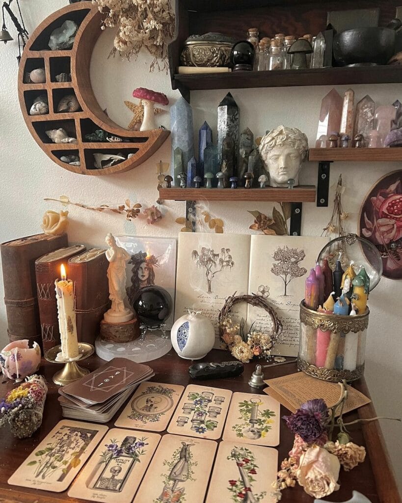 - Divination Tables: Create a small corner with a table dedicated to tarot, runes, or crystal ball gazing. Set it up with candles, your favorite deck, and a cloth for a full magical experience.