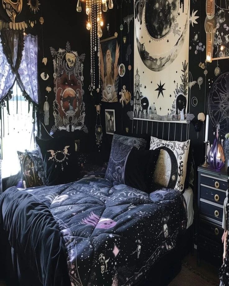 Tapestries are an excellent way to transform the atmosphere of a room quickly. Choose fabrics with mystical patterns, such as stars, moons, constellations, or occult symbols, and hang them on walls, use them as bedspreads, or even as decorative tablecloths.